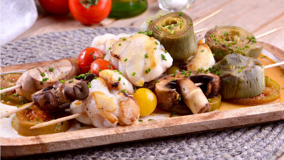 Cuando lo tengas todo, monta las brochetas con las alcachofas, el rape, los champiñones y los tomates cherry. Y, ahora, solo es cuestión de hacerlo al horno o a la sartén con un poco de aceite de oliva virgen. No te olvides de añadir las especias que más te gusten, como pimienta blanca y orégano.