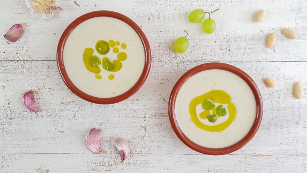 Ajoblanco o gazpacho de almendras, una receta muy fácil, que se prepara muy rápido con una batidora. Esta receta es típica de la zona de Andalucía y
