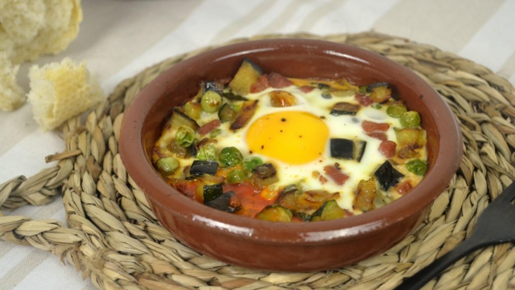 Seguidamente, repartimos la mezcla en cazuelas individuales dejando un huevo en medio para poder poner el huevo. Una vez que lo tengamos montado, horneamos con el horno precalentado a 200º C y el tiempo dependerá del punto en el que más te gusten los huevos.