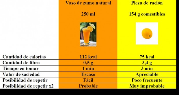 En resumen: el zumo aporta más calorías, menos fibra, menos saciedad y la posibilidad de tomar “más de la cuenta” es mucho mayor… entre otras cuestiones (y todo ello suponiendo que además no se le añada azúcar).